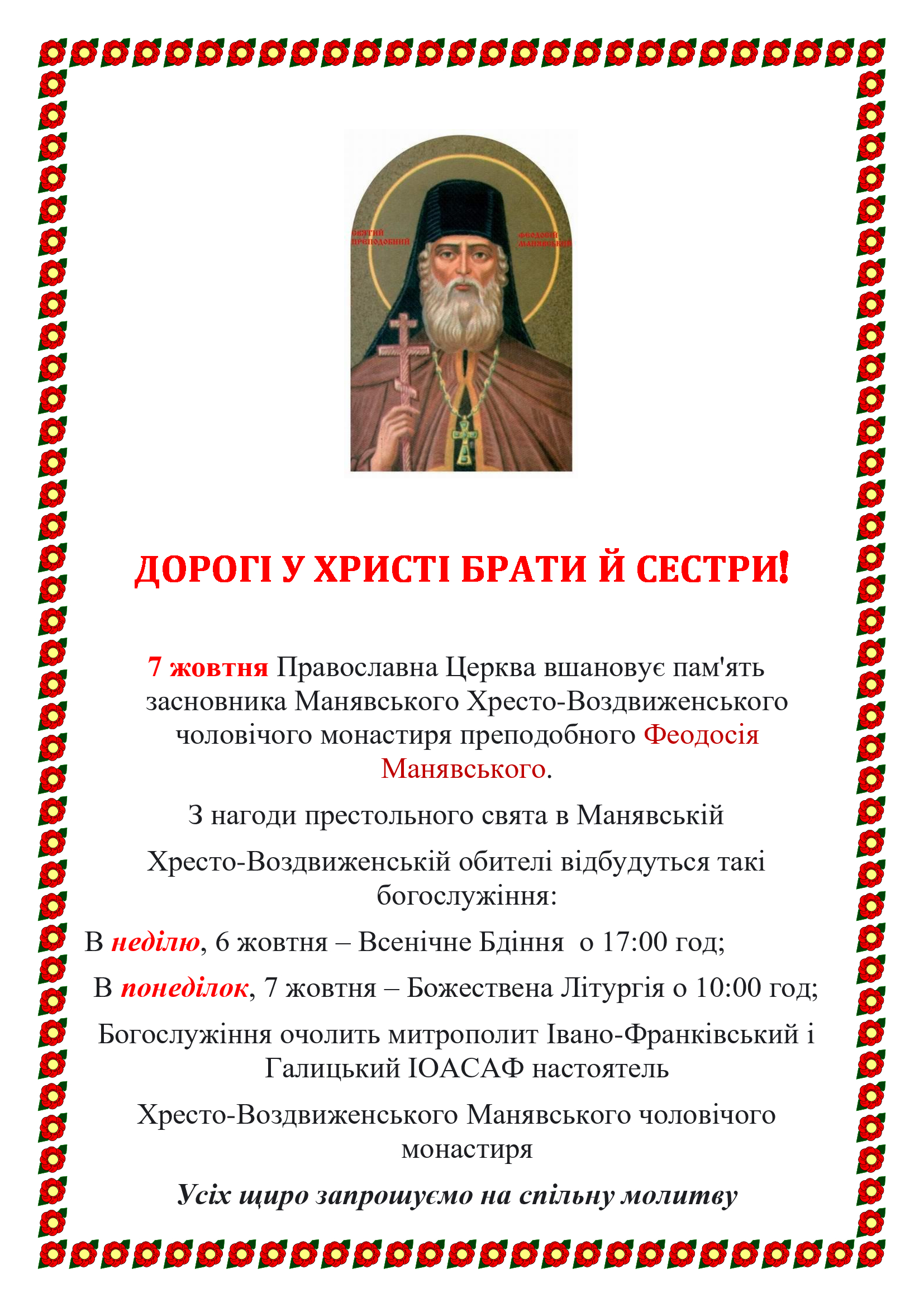 На передодні свята (пятниця) в Манявському Хресто-Воздвиженському чоловічому монастирі буде звершуватися Всенічне бдіння о 17.00 годині. Самого свята (субота) о 10.00 годині буде звершуватися Божествена Літургія в Соборному храмі обителі.